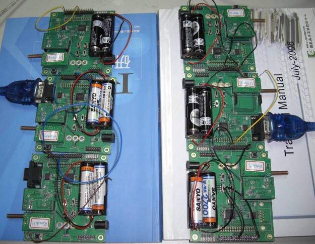 These are the devices we designed. Basically we assume a person wears two sensors and one data aggregator (the one in the middle connect to the RS232 cable). Sensors would periodically send ECG data to the data aggregator.