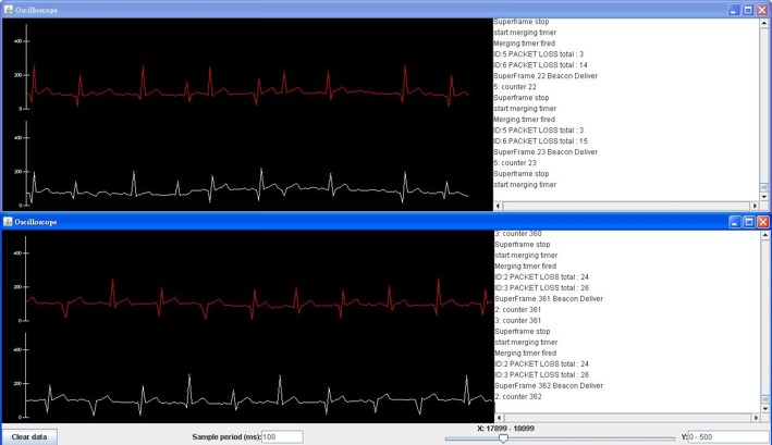 Here we consider two networks (two people) coexist at the same place. Sensors are continuously collecting electrocardiography (ECG) data and send to the data aggregator periodically. After receiving data, data aggregator would send the data to computer and show the ECG on a self-coded java oscilloscope.