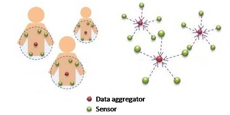 This is the project related to my master thesis. Wireless Body Area Network consider the scenario that people wearing several devices like sensors for monitoring heart rate, blood sugar level … etc. Like the figure below, every person might wear several sensors (green) for different purposes. After gathering data for a period, sensors would send data to the data aggregator (red) for further process.
